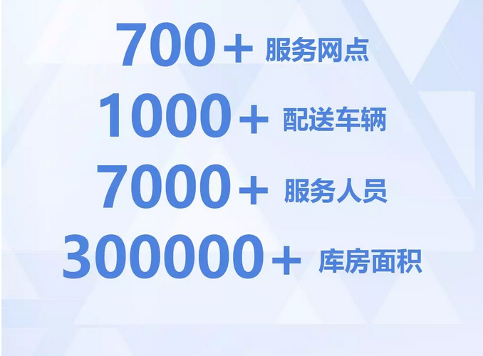 在全國(guó)23個(gè)省、4個(gè)直轄市、5個(gè)自治區(qū)建立了近700個(gè)服務(wù)網(wǎng)點(diǎn),全國(guó)庫(kù)房面積30多萬(wàn)平方米,7000多服務(wù)人員,1000多配送車輛。