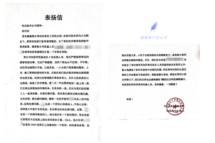 近日,巨沃收到了一封來(lái)自長(zhǎng)春中之杰食品有限公司(以下簡(jiǎn)稱“中之杰”)發(fā)來(lái)的表?yè)P(yáng)信,信中中之杰對(duì)巨沃實(shí)施團(tuán)隊(duì)在項(xiàng)目實(shí)施期間全力配合,認(rèn)真負(fù)責(zé)、及時(shí)響應(yīng)的工作態(tài)度、專業(yè)的技術(shù)能力以及服務(wù)水平給予高度肯定。感謝客戶的表?yè)P(yáng)與信任,在此,巨沃科技也對(duì)中之杰團(tuán)隊(duì)在服務(wù)期間給予的配合與支持表示感謝。